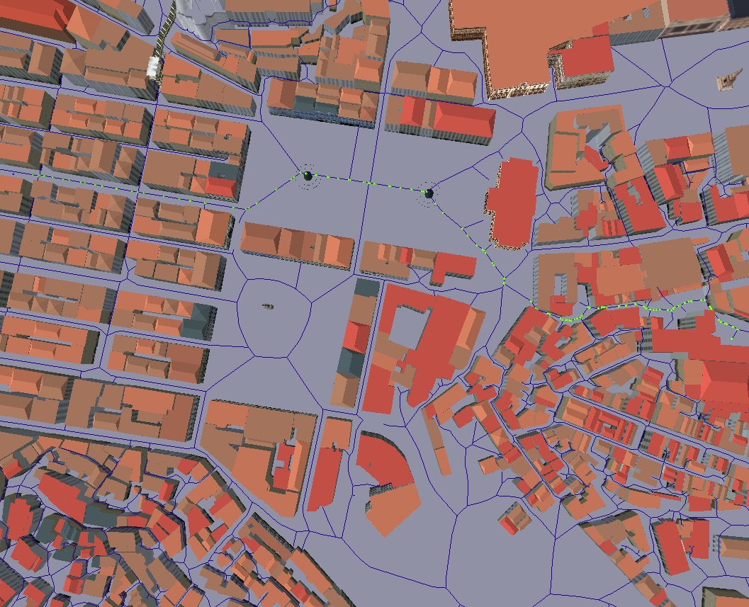 With the plug-in findpath, the shortest path within a city can be calculated and visualized. As virtual city models generally don't include any information about the course of the streets, we extract a street graph from the VRML geometry. |